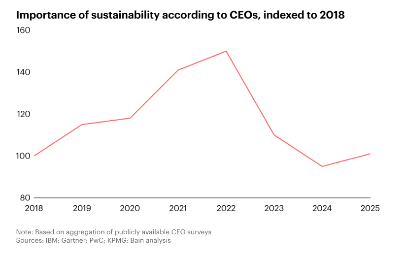 Nonostante recenti fattori geopolitici abbiano attenuato il generale entusiasmo e la più ampia attenzione verso i temi della sostenibilità, i ceo, così come gli investitori, continuano a considerarla una priorità strategica. La terza edizione dell’analisi “The Visionary CEO’s Guide to Sustainability 2025” curata da Bain & Company, segnala che l’apparente calo di attenzione verso la sostenibilità osservato tra il 2023 e il 2024, sembra oggi parzialmente superato nelle intenzioni. L’analisi di oltre 35.000 dichiarazioni di ceo di 150 grandi aziende mostra in realtà una traiettoria evolutiva: la sostenibilità non è più vista solo come un obbligo o una questione etica ma, sempre più, come un vero e proprio driver di valore per il proprio business.