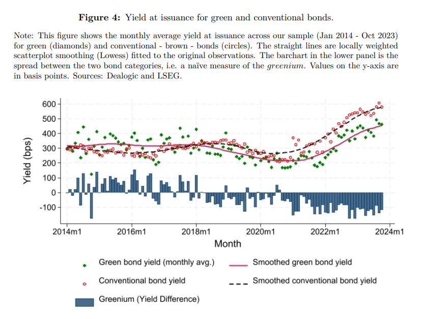 Dall’analisi condotta su emissioni globali tra il 2014 e il 2023, è emerso che, in media, la “green label” consente un vantaggio di circa 16 punti base rispetto alle obbligazioni tradizionali. Tuttavia, quando l’emittente presenta un elevato punteggio ambientale, il greenium può raddoppiare. In altre parole, oltre a mostrare una preferenza generale per gli asset green, gli investitori sembrano valutare attentamente la climate awareness e la performance dell’azienda emittente, accettando un rendimento inferiore pur di mantenere nei propri portafogli le obbligazioni emesse da tali società. Infatti, il raddoppio del greenium riguarda solo i green bond emessi da società che si collocano nel terzile superiore della distribuzione.