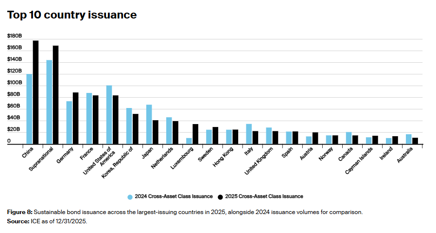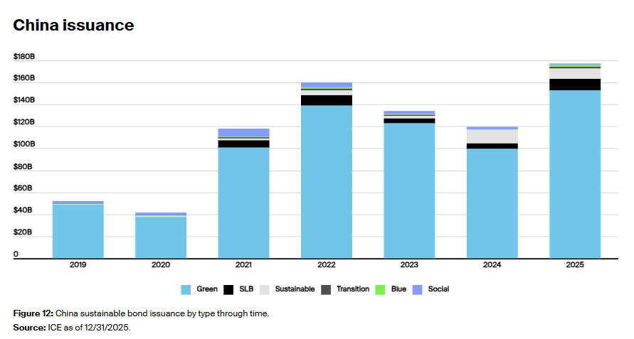 Nel Sustainable Bond Report 2025 pubblicato da Intercontinental Exchange (Ice), emerge con chiarezza il ruolo dominante della Cina nel mercato globale delle obbligazioni sostenibili. Nel 2025, infatti, la Cina si è affermata come il principale emittente mondiale di sustainable bond, superando nettamente le altre aree geografiche, con un aumento su base annua superiore al 30 per cento. A tale aumento hanno probabilmente contribuito le policy nazionali cinesi di green finance, insieme alla crescita dei programmi di sustainable bond del settore bancario.