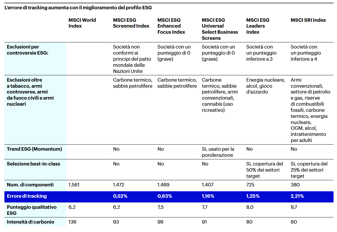 In generale, più titoli un Etf esclude dal suo indice originario, tramite uno screening negativo o positivo più severo, maggiore è il potenziale miglioramento del profilo Esg, ma anche il livello di errore di tracking è più elevato.