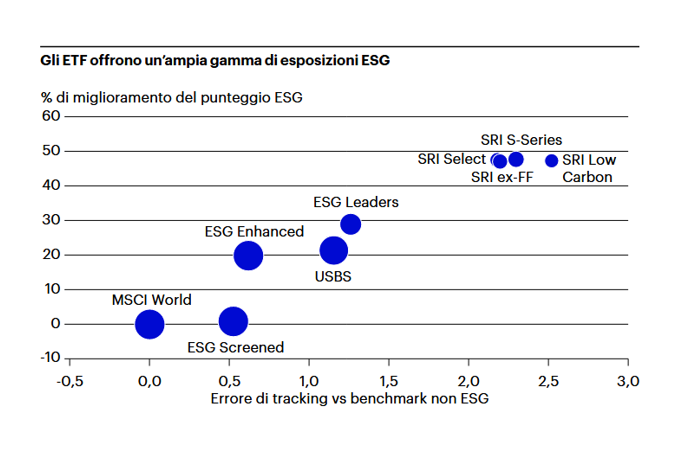 Una volta che gli investitori hanno chiarito i propri obiettivi finanziari e non finanziari, sono pronti a selezionare l’Etf Esg più adatto. Come mostrato dal grafico sottostante, gli Etf Esg possono essere progettati in diversi modi, ognuno dei quali varia per il livello di precisione con cui vengono affrontate le questioni Esg. Il grafico illustra il miglioramento nei punteggi Esg complessivi e il conseguente errore di tracking per una serie di indici Esg derivati dall’indice Msci World originario.