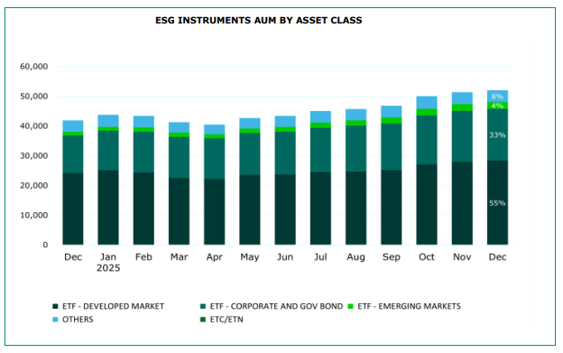Secondo le statistiche diffuse da Borsa Italiana, il 2025 si è chiuso positivamente per gli Etf Esg in termini di Aum: a dicembre è stato raggiunto il picco massimo, con masse in gestione oltre i 50 milioni di euro, in crescita di circa 10 milioni rispetto all’anno precedente.