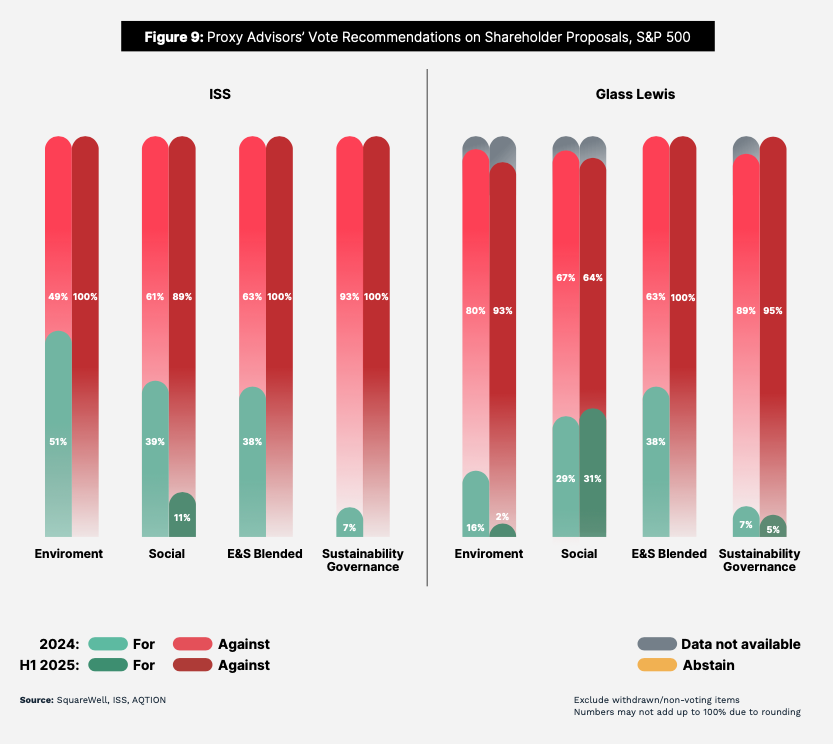 La forte contrapposizione ideologica sugli Esg in atto negli Stati Uniti che si esplica in pressioni politiche e legali sta giocando un ruolo determinante nelle dinamiche sul settore. Secondo il report, nel 2025 a causa del clima ostile le richieste degli azionisti relative alla sostenibilità hanno subito una contrazione del 39% rispetto all’anno precedente. Non sono solo i numeri a confermare la tendenza in atto: entrambi i consulenti hanno comunicato di aver ricalibrato anche sul piano formale il proprio approccio alla sostenibilità per il prossimo futuro. A partire dal 2027, Glass Lewis abbandonerà l’attuale politica interna per passare esclusivamente a strategie personalizzate basate sulle esigenze dei clienti. Iss ha già modificato le proprie linee guida per l’anno in corso e inizierà a valutare le proposte di sostenibilità “caso per caso”, in sostituzione della vecchia prassi generalmente favorevole a tali richieste.