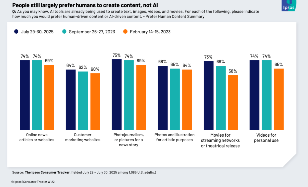 Aumentano le persone che referiscono che i contenuti (testo, immagini, video) siano realizzati dall’uomo piuttosto che dalla macchina. Secondo l’ultimo sondaggio in questo senso dell’Ipsos Consumer Tracker, circa tre americani su quattro desiderano che siano gli esseri umani a creare contenuti di informazione e intrattenimento. Due su tre desiderano che siano gli esseri umani a creare i contenuti di marketing e persino quelli artistici.