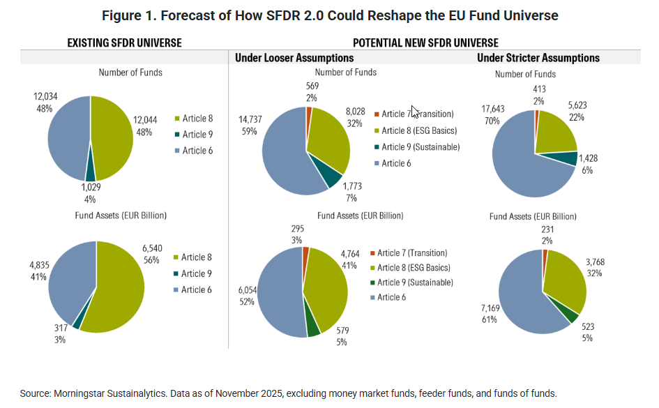 A livello aggregato, secondo le recenti stime di Morningstar, il numero di fondi sustainability-related europei (nuovi articoli 7, 8 e 9) sarà significativamente inferiore rispetto agli attuali articoli 8 e 9, in particolare i fondi articolo 8 subiranno un forte ridimensionamento. I fondi non classificati come sustainability-related (articolo 6) saranno invece predominanti.
