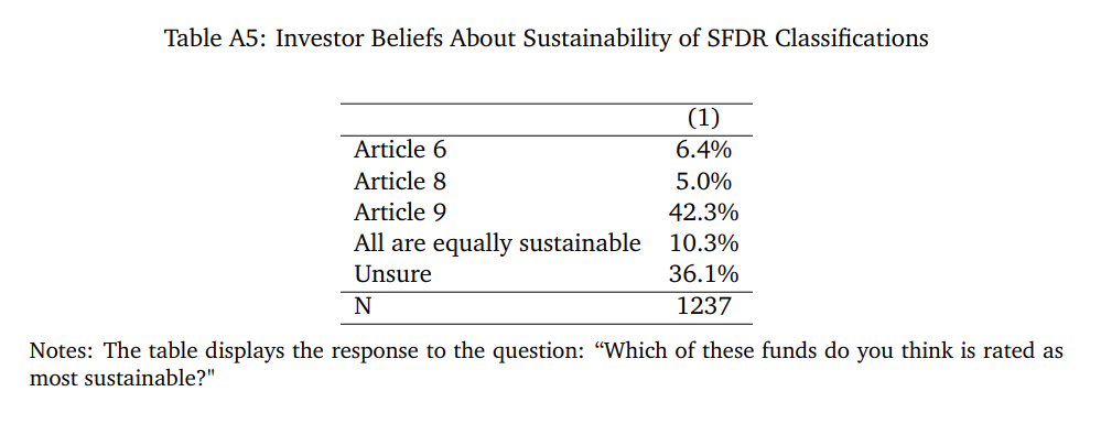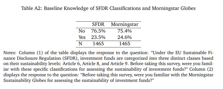 Oltre all’indagine sopra evidenziata, gli autori hanno avviato un sondaggio con investitori europei, nei Paesi in cui il Sfdr era applicato, dal quale è emerso che molti hanno avuto difficoltà a interpretare le disclosure Sfdr. Le informazioni sulla Sfdr infatti non erano ben comprese e solo il 23,5% dei 1.465 investitori finali aveva una conoscenza di base della regolamentazione (Tabella A2).