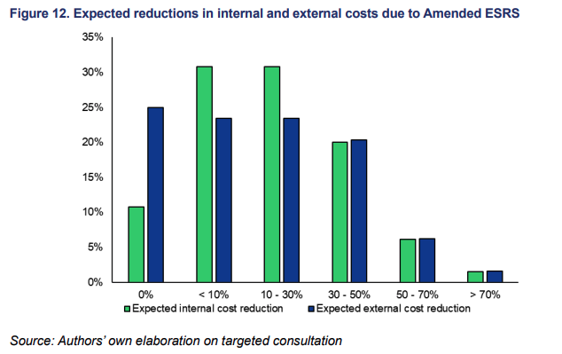 Secondo il report, la revisione comporterà risparmi per le imprese soggette alla Csrd. Tra il 2027 e il 2031, i risparmi stimati nel periodo ammonteranno a 3,7 miliardi di euro, mentre prendendo in considerazione l’intera filiera, i risparmi salgono a circa 4,7 miliardi, pari a una riduzione complessiva dei costi del 44%. Nello specifico le aziende indicano sia una riduzione dei costi interni, tempo dedicato dai dipendenti alla attività di raccolta, elaborazione dati e reporting, sia dei costi esterni come quelli sostenuti per le l’infrastrutture IT e i servizi di consulenza. Vengono inoltre accolte con favore la razionalizzazione dei contenuti e l’eliminazione delle duplicazioni, a vantaggio di una maggiore facilità di comprensione e applicazione degli standard. Allo stesso tempo le imprese non ritengono che la semplificazione comprometterà la qualità dei dati Esg né tantomeno l’accesso al credito e costi di forme di finanziamento green.