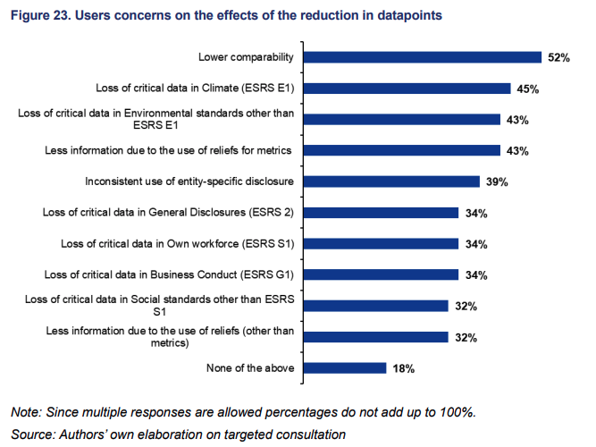 Dallo studio emerge quindi un forte disallineamento tra la percezione delle imprese e quella degli utilizzatori dei dati, in particolar modo del settore finanziario. Le prime sembrano considerare principalmente il contenimento dei costi, ritenendo nullo o limitato l’impatto della riduzione degli obblighi di rendicontazione sulla raccolta di capitali, mentre sono proprio coloro che dovranno fornire queste fonti di finanziamento a essere più scettici e preoccupati dagli effetti che la revisione degli Esrs avrà sulla valutazione Esg delle aziende.