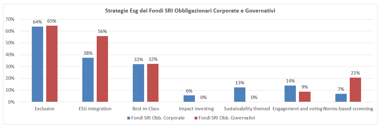 Emerge in questa analisi un dato di rottura: tra le società che offrono i fondi governativi infatti il criterio più utilizzato è quello dell’integrazione Esg (60%), seguito a breve distanza da esclusione (55%) e da best in class (30%).