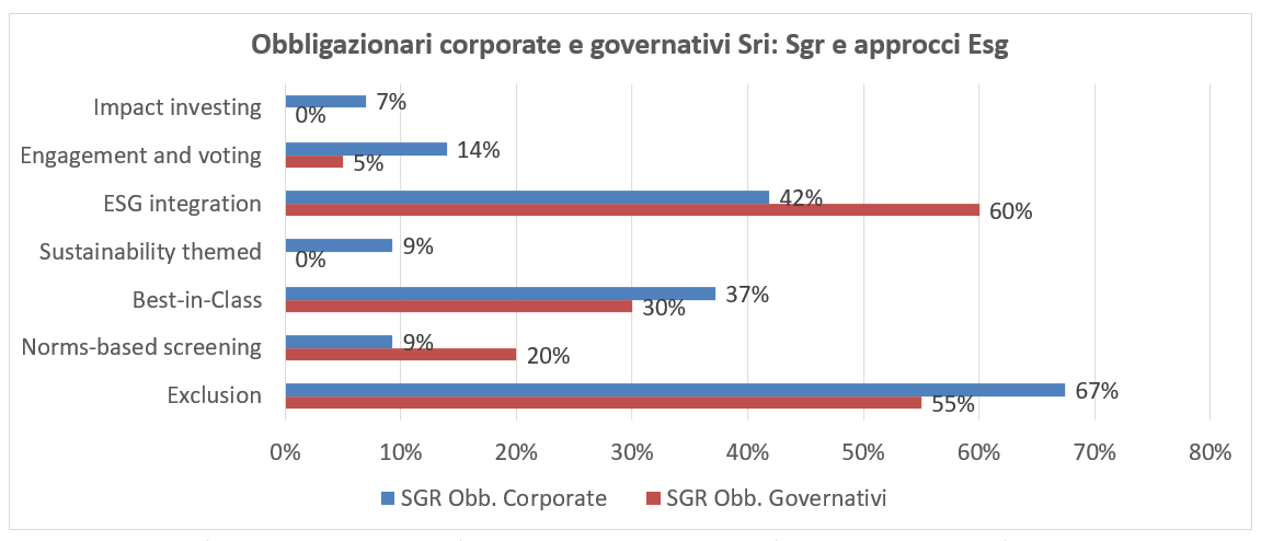L’indagine sugli approcci Esg è stata sviluppata anche considerando le Sgr. L’analisi ha portato ad analizzare 43 società che hanno almeno un fondo obbligazionario corporate Sri, e circa la metà (20 in tutto) la cui offerta contempla invece almeno un fondo obbligazionario governativo.