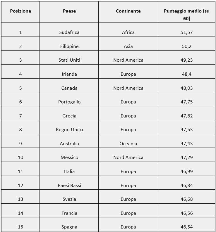 Il Sudafrica si posiziona al primo posto con un punteggio medio di “generosità” pari a 51,57, seguito dalle Filippine (50,2) e dagli Stati Uniti (49,23). L’Italia si classifica all’undicesimo posto nello studio (vedi sotto la classifica parziale). A proporre una classifica di generosità per nazioni è una ricerca promossa da Remitly, fornitore di servizi finanziari digitali.