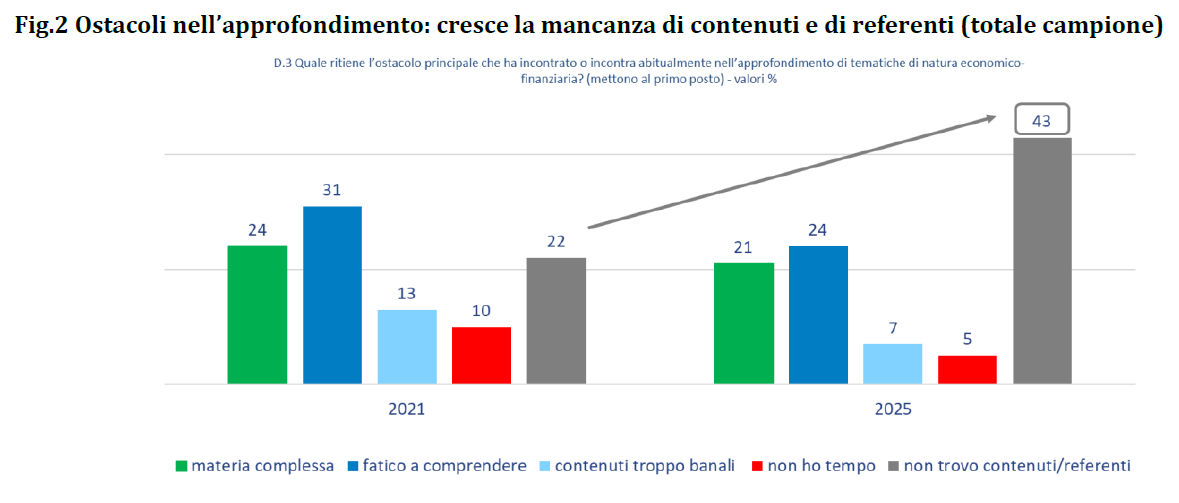 Nonostante la crescente volontà di approfondire i temi economici e finanziari, tra i risparmiatori italiani persiste una certa “confusione” nel navigare i troppi contenuti disponibili e nel riconoscere fonti e referenti affidabili. Un disorientamento comune a tutte le generazioni, che non accenna a ridursi. Negli ultimi 4 anni, infatti, la percentuale di quanti dichiarano di non trovare contenuti o referenti adeguati è salita, dal 22% al 43%, superando la difficoltà stessa della materia, percepita quale ostacolo principale fino al 2021.