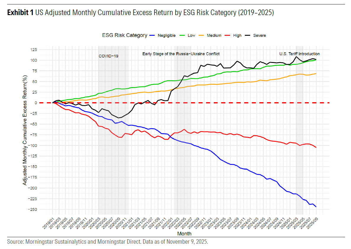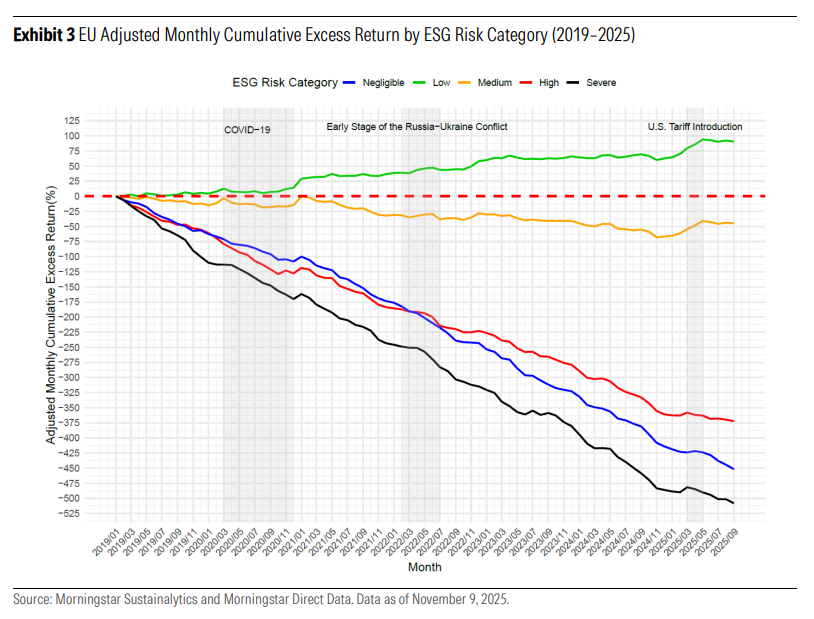 I portafogli a basso rischio Esg si confermano i più resilienti, mentre quelli a rischio Esg alto o grave hanno registrato una sottoperformance profonda e duratura. I divari di rendimento indicano che il mercato penalizza sistematicamente le aziende con pratiche Esg deboli, pur continuando a premiare con costanza i profili a basso rischio Esg.