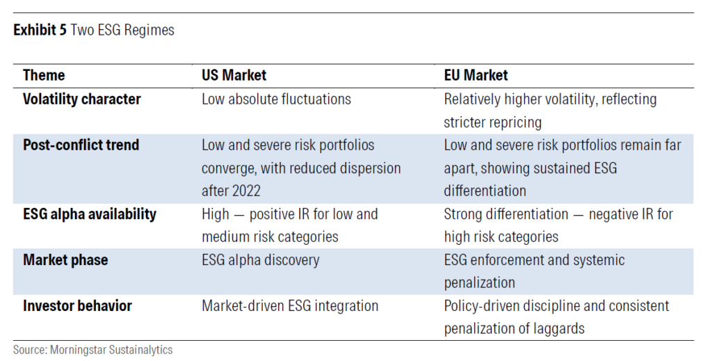 Inoltre, a differenza degli Stati Uniti, nell’Ue i portafogli a rischio Esg Low e Severe restano nettamente distanti anche dopo il 2022, evidenziando «una differenziazione ampia e duratura, rafforzata sia dagli standard di mercato sia dal quadro normativo».