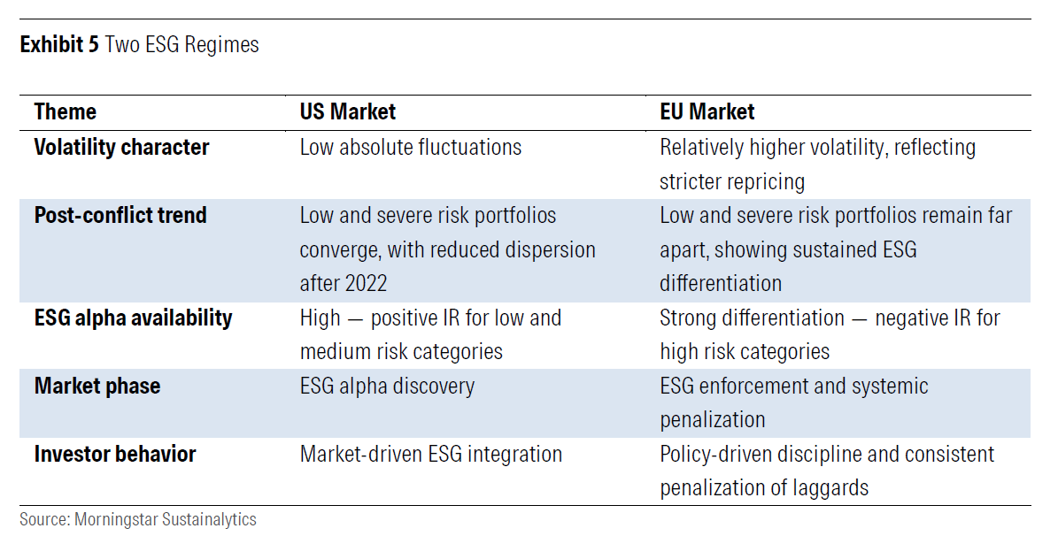 È quanto emerge dal report pubblicato a marzo da Morningstar Sustainalytics, che evidenzia una crescente divergenza tra Europa e Stati Uniti nella valutazione e nell’impatto dei rischi Esg sulle performance di portafoglio. Gli Stati Uniti premiano le aziende a basso rischio Esg attraverso una performance market-driven, mentre l’Ue applica un sistema policy-driven che penalizza le aziende con rischio Esg elevato.