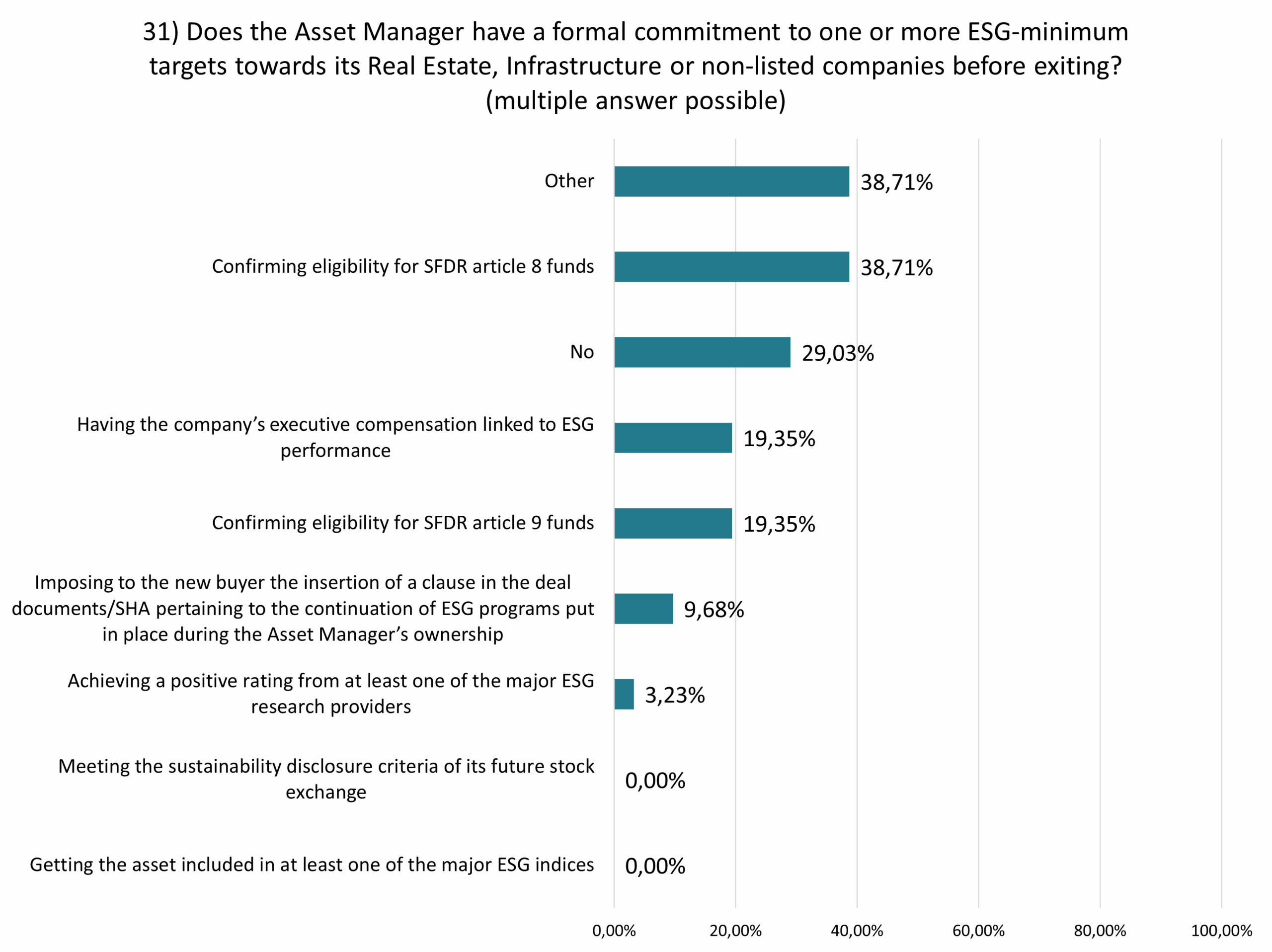 Alla domanda se l’asset manager abbia un impegno formale a raggiungere uno o più target Esg per i suoi investimenti in Real Estate, Infrastrutture o Aziende non quotate, prima di disinvestire per realizzare profitto, i risultati sono molto positivi, in quanto mostrano un complessivo 70,79% che dichiara di avere formalizzato tale impegno. Entrando nel dettaglio delle percentuali: il 38,71% delle Sgr si impegna a rendere il proprio asset idoneo per i fondi art. 8, prima di venderlo, il 19,35% punta a legare la compensazione dei membri esecutivi dell’azienda alla performance Esg della stessa, un altro 19,35% si impegna a rendere l’asset ammissibile ai fondi art. 9, il 9,68%, per procedere con l’exit, impone al futuro compratore di inserire una clausola nel contratto per cui si impegni a continuare i programmi Esg avviati dalla Sgr, infine il 3,23% punta a far ottenere un rating Esg positivo all’asset almeno da uno dei rating provider più rilevanti.