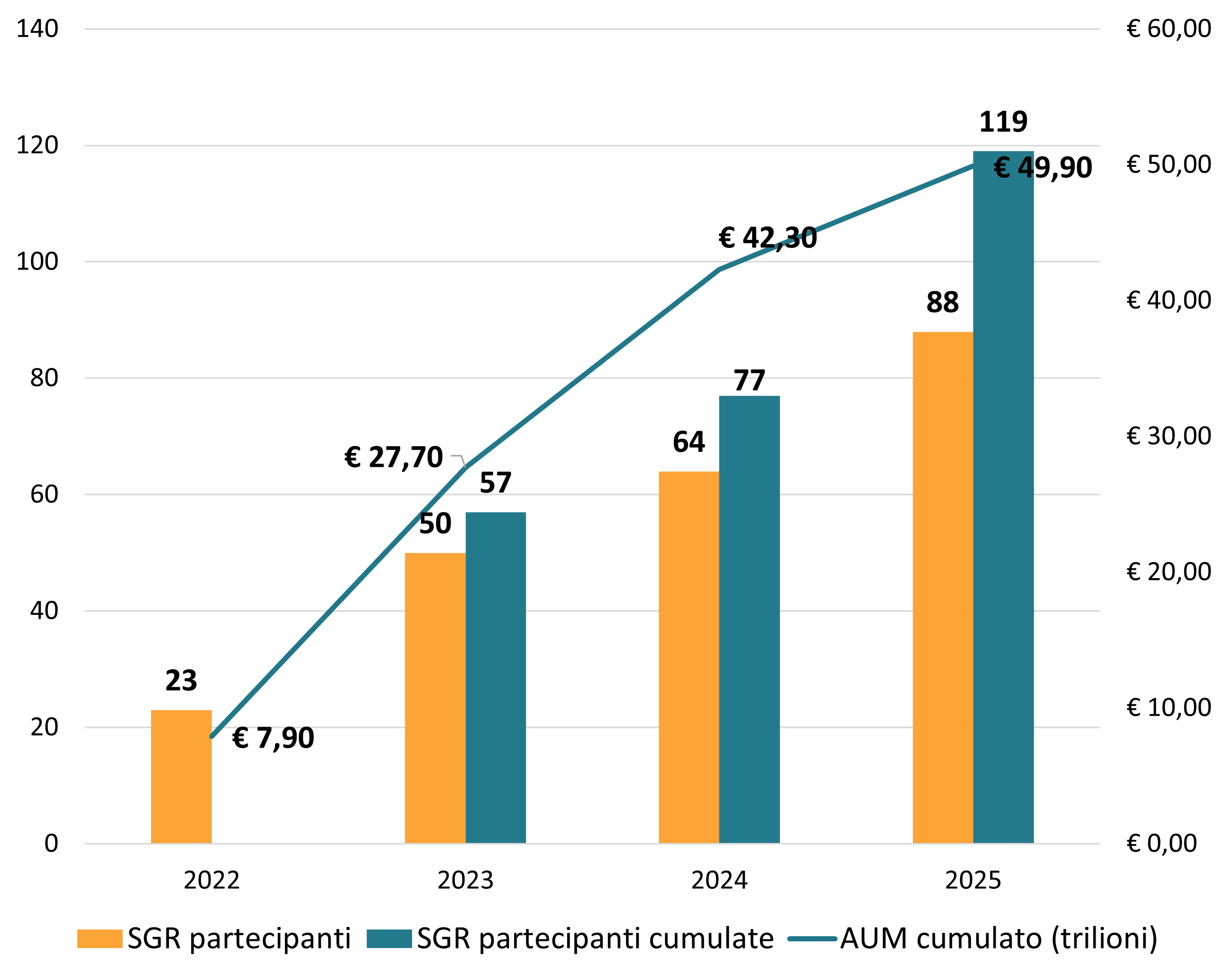 Nel corso degli anni, ESG.IAMA (ESG Identity Asset Manager Assessment) ed ESG.IAMA Private hanno coinvolto un numero sempre maggiore di Sgr internazionali. A fine marzo 2026, infatti, sono stati analizzati e valutati un totale di 119 asset manager, per un Aum complessivo di circa 49,9 trilioni di euro: