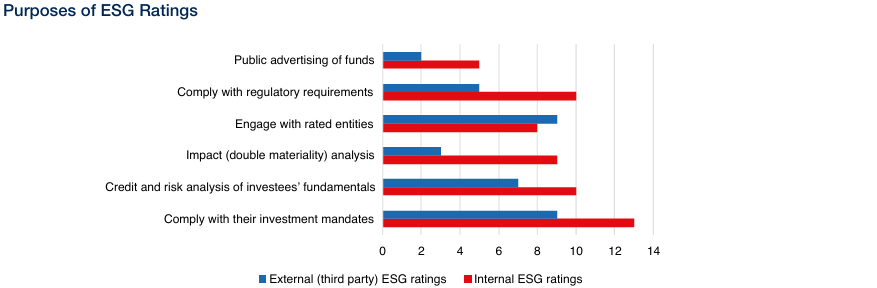 Gli usi dei rating Esg sono molteplici: i rating di terze parti vengono impiegati principalmente per rispettare i mandati di investimento e per il dialogo con le entità valutate, mentre quelli interni risultano più rilevanti per la conformità normativa e per l’analisi dei rischi e della doppia materialità, oltre che sempre per rispettare i mandati di investimento. Sulla materialità, quasi tutti i rispondenti, dodici su quattordici, ritengono che i rating Esg dovrebbero incorporare anche la dimensione d’impatto.