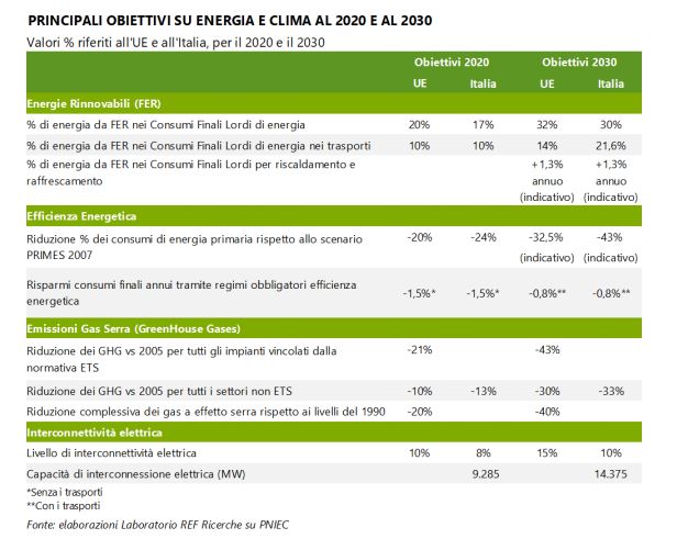 Il Pniec intende coprire il periodo 2021-2030 e aggiorna quanto già delineato con la Strategia Energetica Nazionale (Sen) del 2017, considerata propedeutica ai fini del varo del Pniec. I punti pivotali del Pniec sono riassunti nella tabella che segue.
