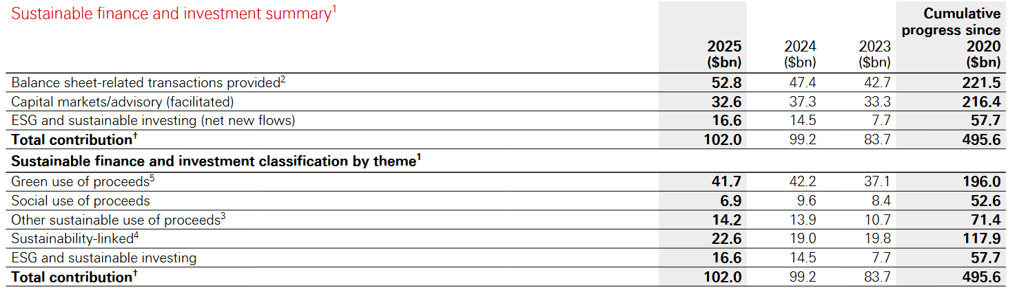 Nel 2025, infatti, Hsbc ha mobilizzato 102 miliardi di dollari per la finanza sostenibile, intesi come volumi di finanziamento, gestione di emissioni obbligazionarie, raccolta di capitali (vedi tabella sotto). Il superamento di quota 100, arriva nonostante un calo nei collocamenti sostenibili, e grazie a un aumento dei crediti Esg e, soprattutto, per un aumento delle masse in gestione Esg.