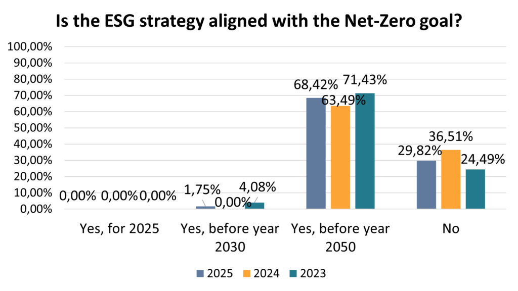 Alla domanda se la strategia Esg dell’asset manager (a livello corporate) sia allineata con l’obiettivo del raggiungimento di zero emissioni nette, i risultati sono positivi. Nel 2025, il 68,42% ha dichiarato di avere la propria strategia allineata con l’obiettivo Net Zero entro il 2050, in linea con il 63,49 e 71,43% rispettivamente delle edizioni 2024 e 2023. L’1,7% ha dichiarato di essere allineato alle zero emissioni entro il 2030, mentre l’anno precedente nessuno lo dichiarava e nel 2023 il 4,08 percento.