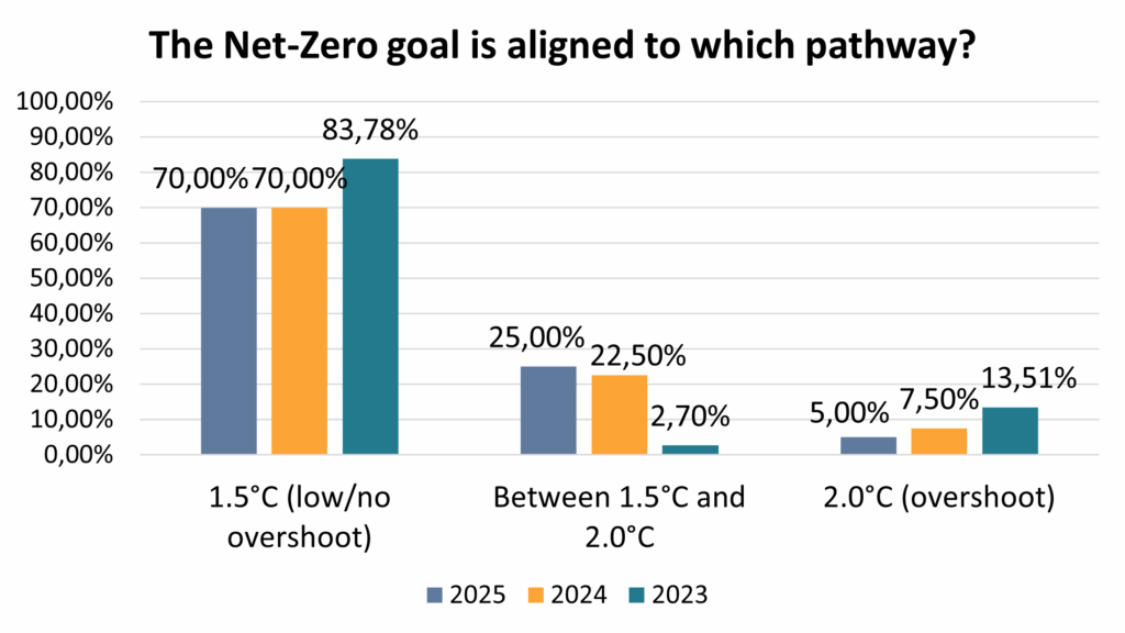 Nel 2025, il 70% dei gestori con l’obiettivo di raggiungimento delle zero emissioni lo ha allineato a un estremamente positivo pathway di aumento della temperatura globale di 1,5°C (low/no overshoot), in linea con l’anno precedente e leggermente sotto al forse eccessivamente speranzoso 83,78% del 2023. Un altro 25% dichiara che il pathway cui sono allineati è entro il range 1,5-2°C, sempre in linea con il 22,5% del 2024, ma in aumento rispetto al 2,7% del 2023. Infine, nel 2025 si registra la risposta più bassa per l’allineamento al pathway di “overshoot” (2°C), al 5%, rispetto al 7,5 e 13,51 percento rispettivamente del 2024 e 2023:
