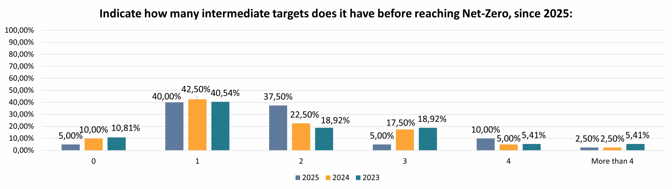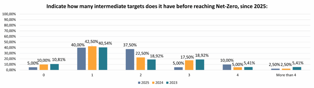 Infine, la serietà dell’obiettivo Net Zero delle Sgr è stata testata chiedendogli il numero di target intermedi fissati (necessari per avere un obiettivo credibile e realizzabile). Questo test è stato “fallito” da circa la metà dei gestori. Nel 2025, il 5% dei rispondenti non ha credibilità sul proprio obiettivo di raggiungimento delle zero emissioni in quanto non ha target intermedi, tuttavia è positivo notare che questa percentuale è calata rispetto al 10 e 10,81% delle edizioni precedenti. Il 40% dei gestori ha un solo target intermedio, che anch’esso è poco rassicurante su un obiettivo che si attesta per quasi tutti i gestori al 2050, in linea con il 42,5 e 40,54 percento degli anni precedenti. Invece, il 37,5% degli asset manager dichiara di avere due target intermedi, rispetto al 22,5% del 2024 e al 18,92% del 2023, con gli altri che hanno anche un numero maggiore, e sempre migliore, di target: